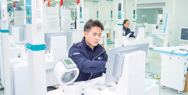 21日,阳新经开区的湖北携康智能医学科技有限公司内,工作人员在对自主研发的智能医疗检测设备进行优化。