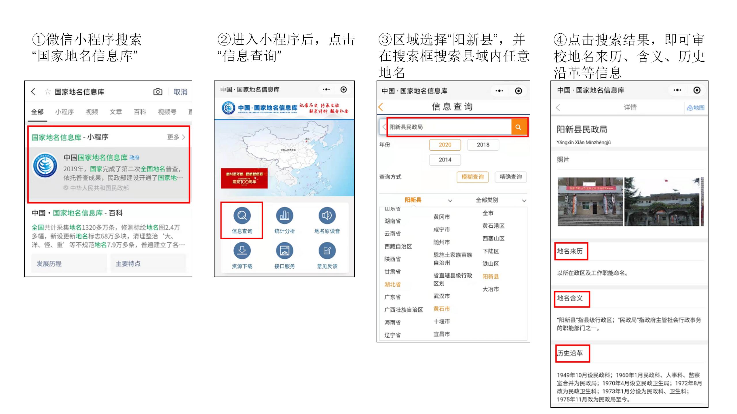 中国·国家地名信息库已试运行,对外公开全国地名信息,为使我县地名信息数据更加准确、真实,诚挚欢迎广大居民参与地名的审校工作,深入挖掘我县地名文化故事,弘扬我县地名文化。在微信搜索小程序“中国·国家地名信息库”,进入后点击信息查询,输入地名便可浏览相关信息,如有疑问请及时联系工作人员修改,期待您的参与,我们将对建议中肯、意见丰富的居民代表予以表彰。