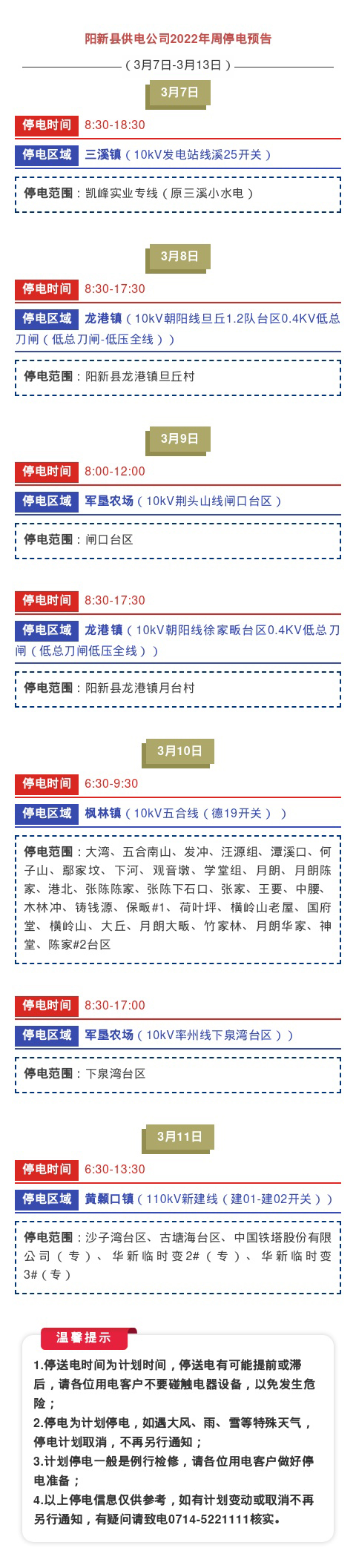 阳新县供电公司2022年周停电预告(3月7日-3月13日)