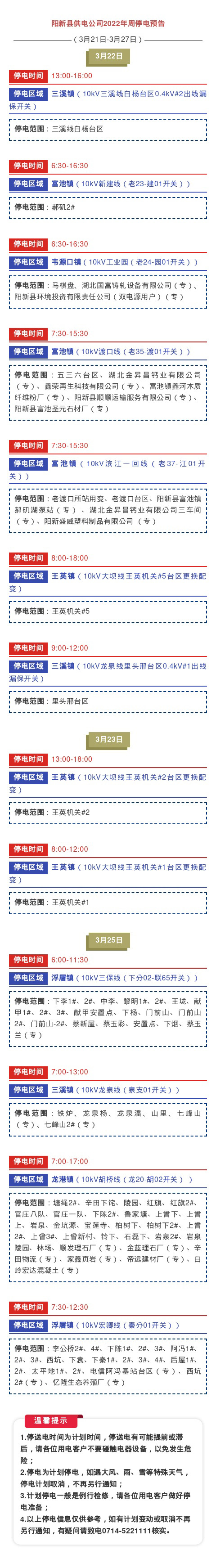 阳新县供电公司2022年周停电预告(3月21日-3月27日)