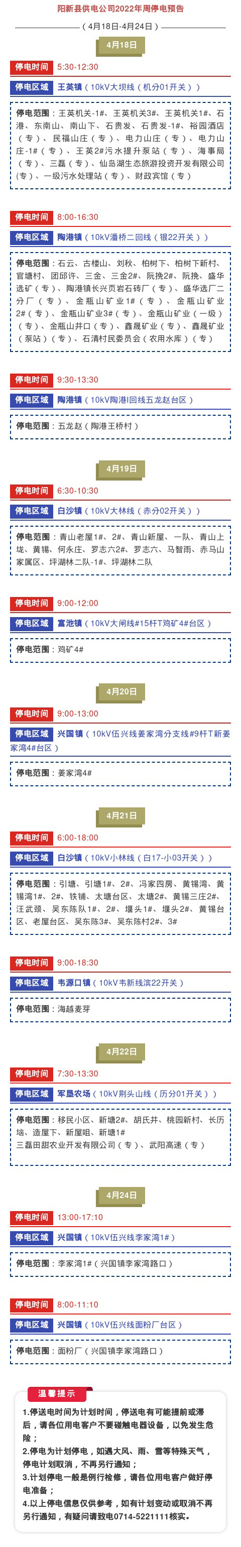 阳新县供电公司2022年周停电预告(4月18日-4月24日)