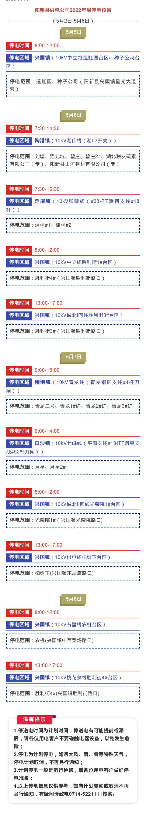阳新县供电公司2022年周停电预告(5月2日-5月8日)
