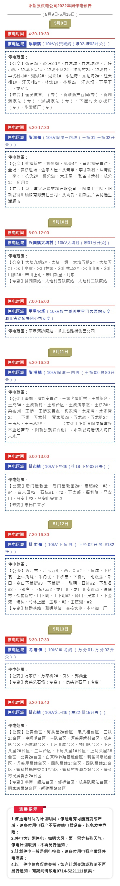 阳新县供电公司2022年周停电预告(5月9日-5月15日)
