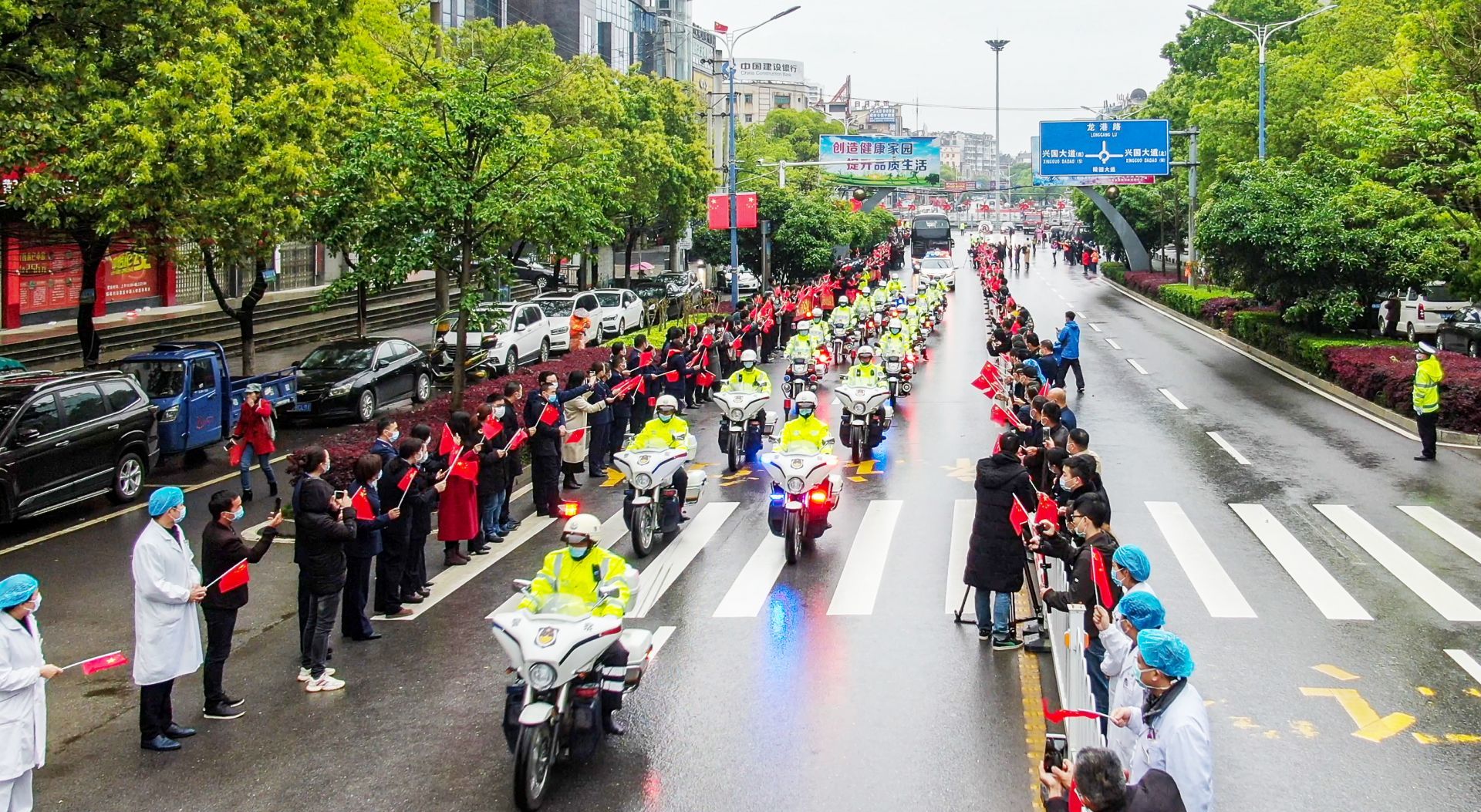 临别之时,大家依依不舍,阳新公安、交警、消防部门出动300余名警力以最崇高的礼遇、最深敬意、最佳形象护航可敬的白衣战士返程深表敬意和惜别之情。在欢送现场和陵园大道两旁,王建华等县领导来自全县各企事业单位职工、社会各界群众、志愿者自发手举国旗,夹道欢送 “江苏亲人”。