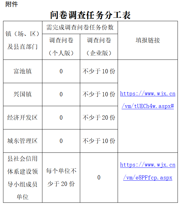 为配合黄石市围绕“我市社会信用体系建设工作存在的问题困难以及对策建议”采取问卷调查方式开展调研,请你们按照问卷调查任务分工及填报链接(见附件),认真组织实施问卷调查工作,注重收集群众呼声和市场主体意见建议。县信用办将于11月15日下午17点通报完成情况。