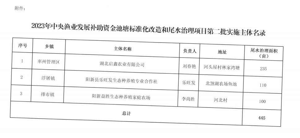 根据湖北省财政厅《关于拨付2023年中央渔业发展补助资金的通知》(鄂财农发〔2023〕63号)和省农业农村厅《办公室关于规范使用2023年湖北省渔业发展补助资金的通知》(鄂农办函〔2023〕186号)文件精神,下达阳新县池塘标椎化改造和尾水治理项目资金832万元,项目通过先建后补形式开展。已公示12家,因距离2024年省级尾水治理目标要求面积还有差距,补充3家尾水治理主体,补充面积445亩。现进行公示,公示期为2024年12月4日至12月9日,共5天。