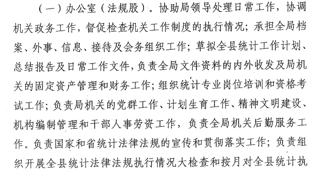 (一)按照国家法律、政策和计划,组织领导和协调全县统计工作,制定全县统计工作措施、统计工作现代化规划、统计调查计划,并组织实施;贯彻落实统计体制改革方案,部署和实施统计方法制度,检查本行政区域内的统计工作。