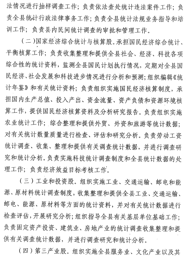 (二)贯彻执行国家建立的国民经济核算体系、统计指标体系和全国统一的基本统计制度;贯彻落实省、市地方统计调查制度;组织领导协调监督检查全县各镇(区)、各部门统计工作,统一组织管理全县统计标准、统计报表工作;审查各部门统计调查计划和调查方案。
