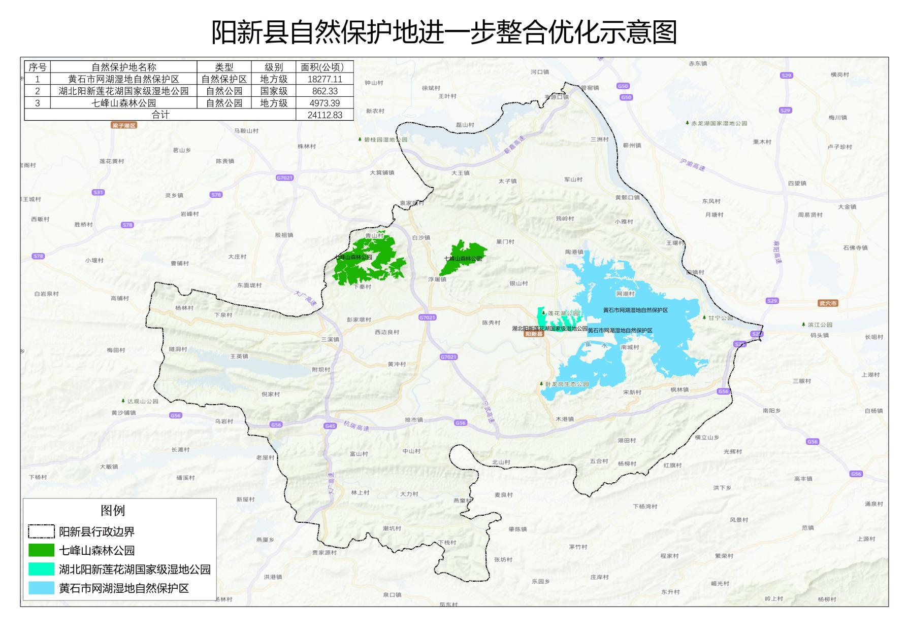 二、进一步整合优化后,阳新县自然保护地总数量保持3处不变,总面积由24316.02公顷变为24112.83公顷。