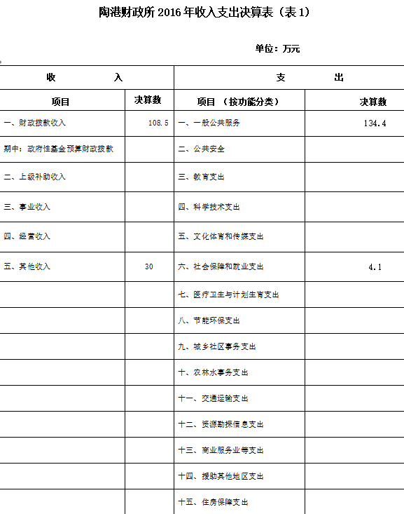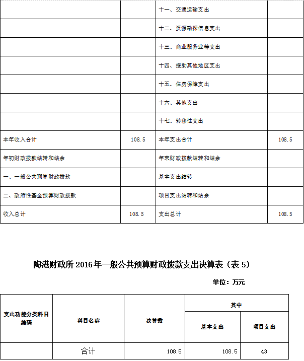 陶港财政所财政拨款收入总决算108.5万元,比2015年相比减少18万元,财政拨款支出总决算108.5万元,比比2015年相比减少18万元。主要原因是人员变动。
