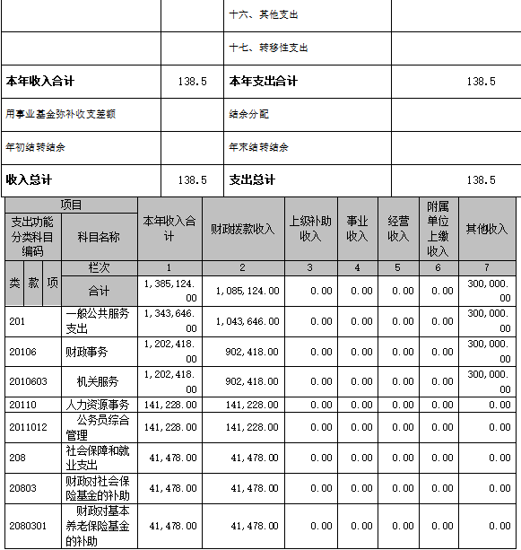 本年收入合计138.5万元,其中:财政拨款收入108.5万元,占78.3%;事业收入   0  万元,占  0   %;经营收入  0   万元,占  0   %;其他收入30万元,占21.7%。