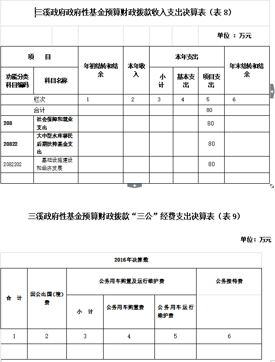 三溪政府政府性基金支出 80万元,用于大中型水库移民后期扶持基金支出80万元。