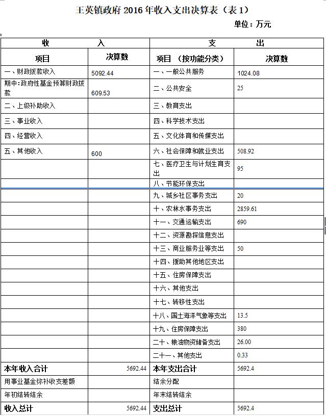 王英镇政府2016年度决算总收入5692.44  万元。其中:财政拨款收入 5092.44万元、事业收入 0万元、经营收入 0万元、其他收入600万元,用事业基金弥补收支差额 0万元,上年度结转结余 0万元。比2015年减少  4751.26 万元。主要原因是省级专项拨款减少,政府性基金预算财政拨款减少。