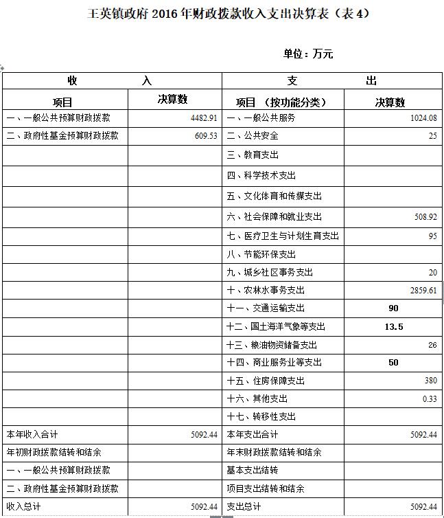 王英镇政府财政拨款收入总决算  5092.44   万元,比2015年相比减少  4741.26万元,财政拨款支出总决算  5092.44   万元,比2015年相比减少  4741.26万元。主要原因是省级专项拨款减少,政府性基金预算财政拨款减少。