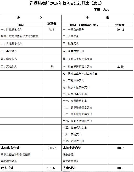 洋港财政所2016年度决算总收入101.5 万元。其中:财政拨款收入 71.5万元、事业收入0 万元、经营收入0 万元、其他收入30 万元,用事业基金弥补收支差额0万元,上年度结转结余 0 万元。比2015年减少19.74万元。主要原因是2016年财政所有2人调出;响应中央八项规定,压缩开支。