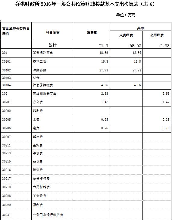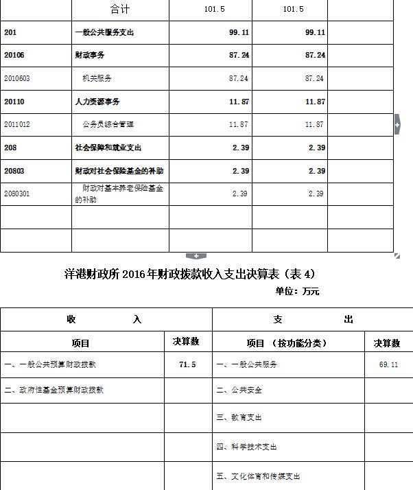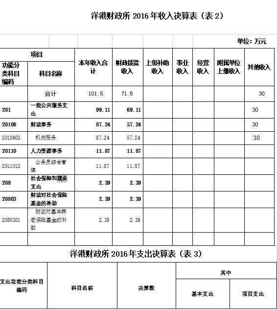 洋港财政所财政拨款收入总决算71.5万元,比2015年相比减少19.74万元,财政拨款支出总决算 71.5万元,比比2015年相比减少19.74万元。主要原因是2016年财政所有2人调出;响应中央八项规定,压缩开支。