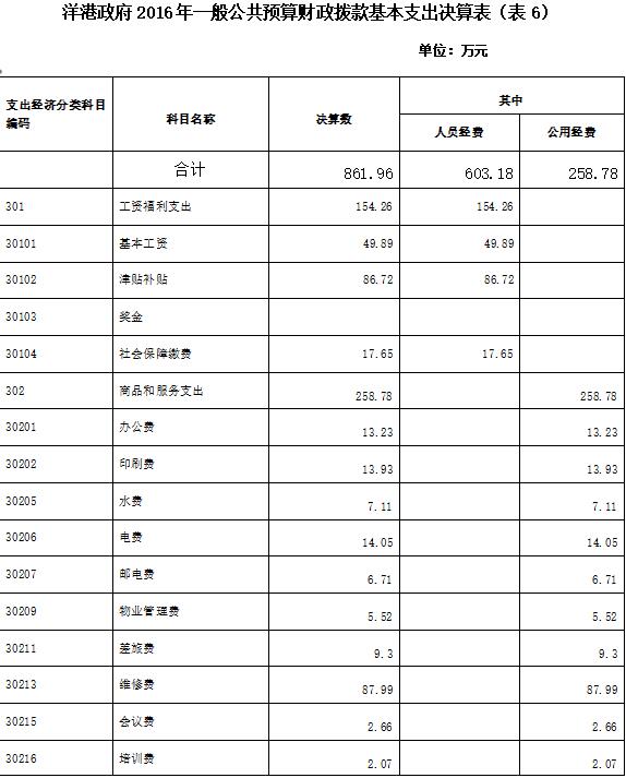 洋港政府公共预算财政拨款基本支出 861.96万元,其中人员经费603.18  万元,包括基本工资、津贴、社会保障缴费、绩效工资、其他工资福利支出、离休费、退休费、抚恤金、生活补助、医疗费、住房公积金、提租补贴、购房补贴,公用经费258.78万元,包括办公费、印刷费、手续费、水费、电费、邮电费、物业管理费、差旅费、因公出国(境)费、维修费、租赁费、会议费、培训费、公务接待费、被装购置费、委托业务费、工会经费、福利费、公务用车运行维护费、其他商品和服务支出、其他资本性支出。