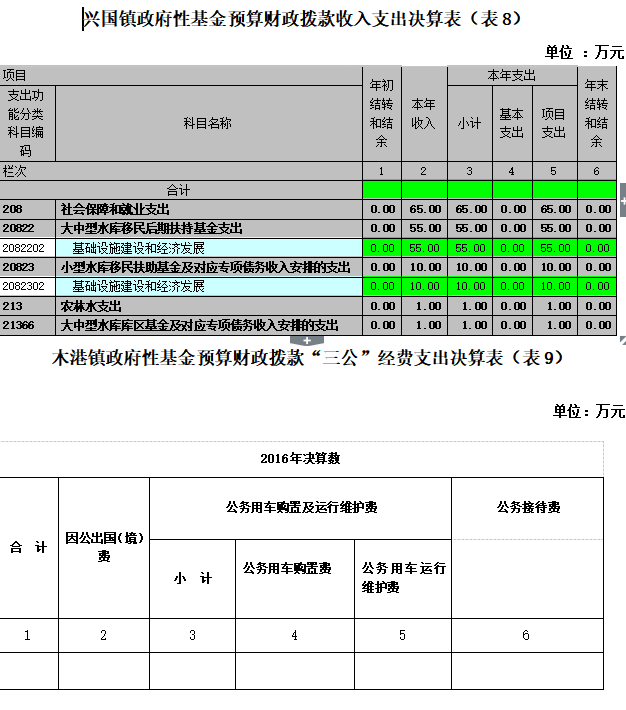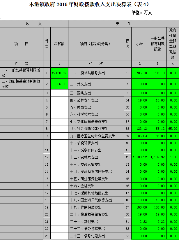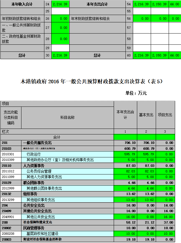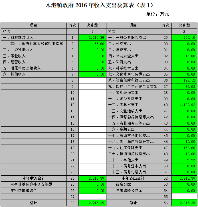 木港镇政府财政拨款收入总决算  2150.39万元,比2015年相比减少  156.24 万元,财政拨款支出总决算  2150.39 万元,比比2015年相比减少  156.24 万元。主要原因是2016年人员调动及退休等。