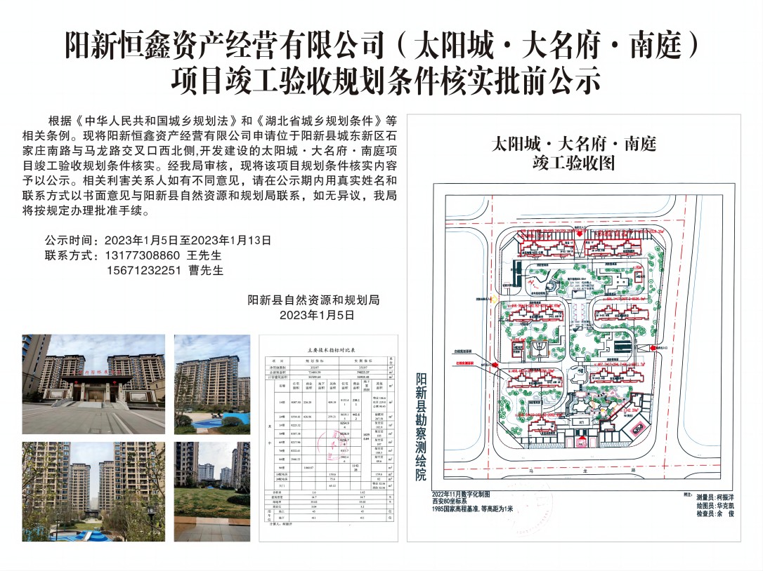 阳新恒鑫资产经营有限公司(太阳城.大名府.南庭)项目竣工验收规划条件核实批前公示