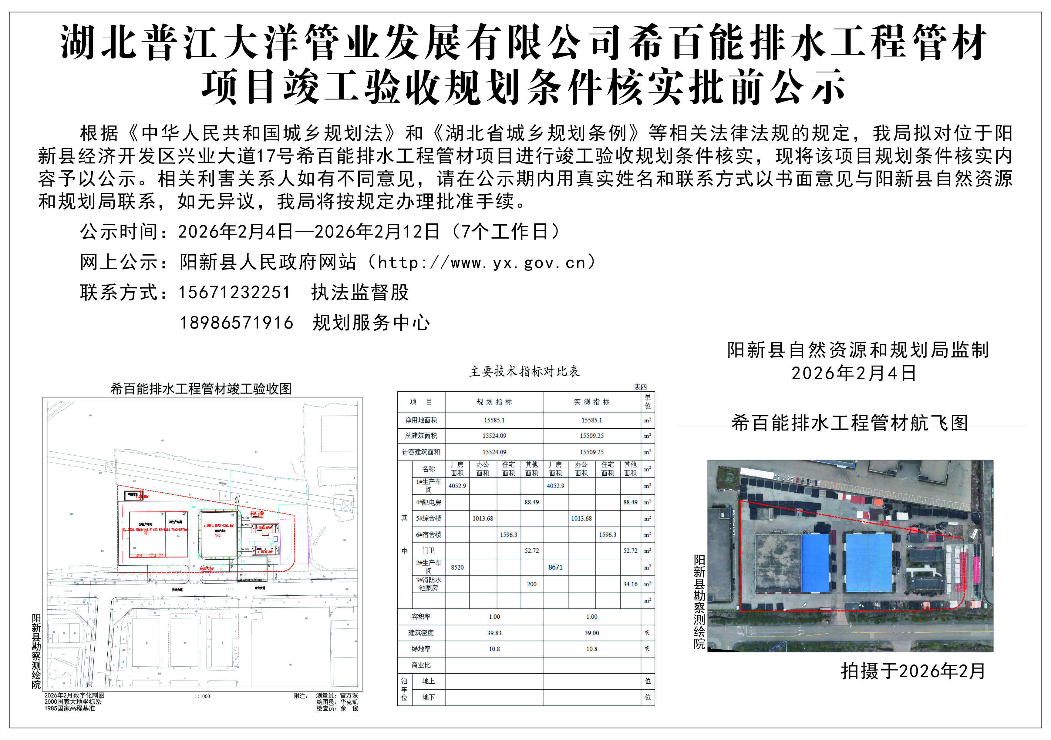 湖北普江大洋管业发展有限公司希百能排水工程管材项目竣工验收规划条件核实批前公示