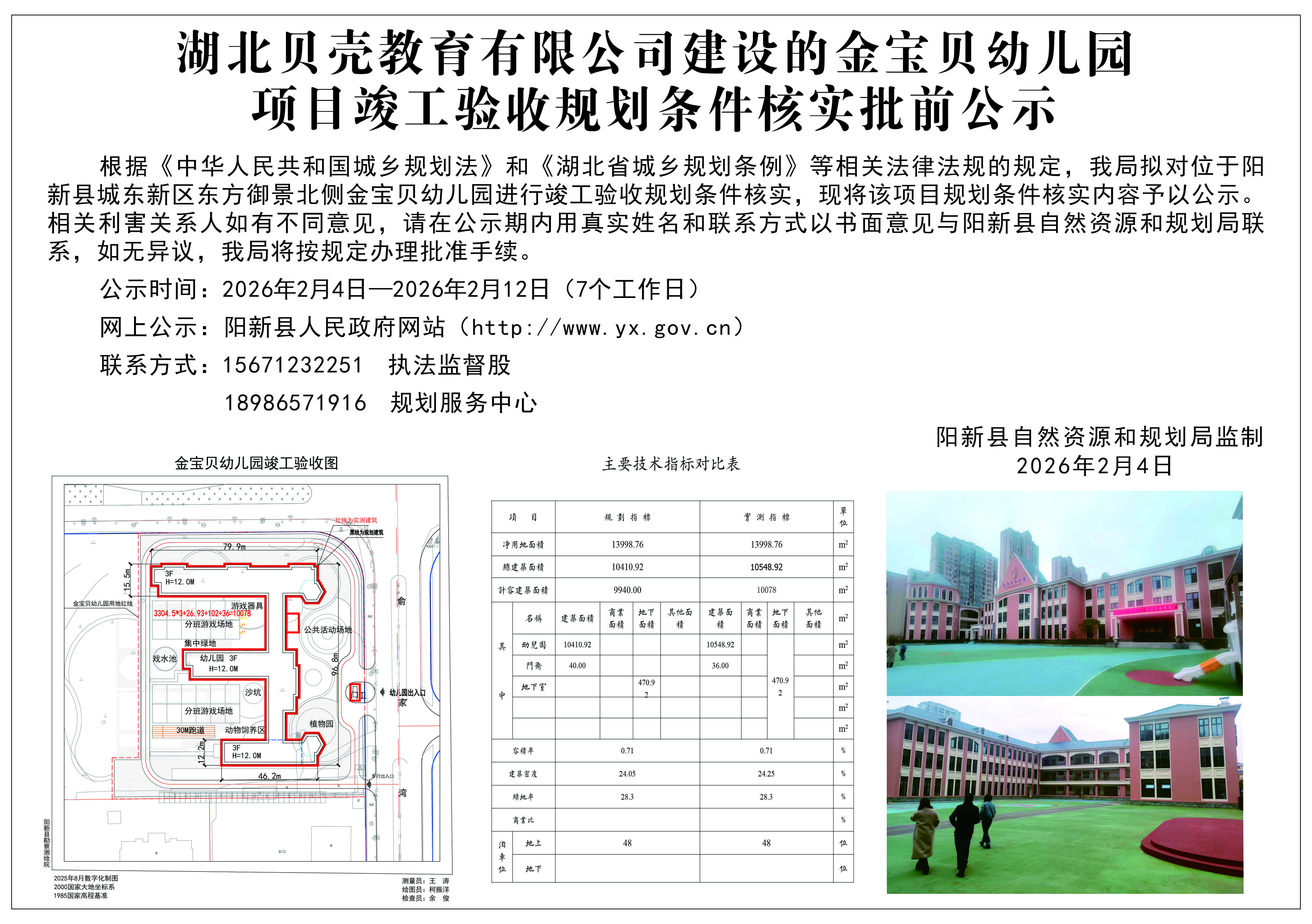 湖北贝壳教育有限公司建设的金宝贝幼儿园项目竣工验收规划条件核实批前公示