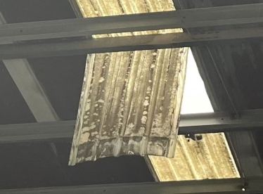 粉末辅料堆棚屋面采用单层压型彩钢板和透明采光板铺设,屋面有一块透明采光板的一端处于塌落状态,一端与檀条连接。坠落地点为水泥硬质地面(见图3)。