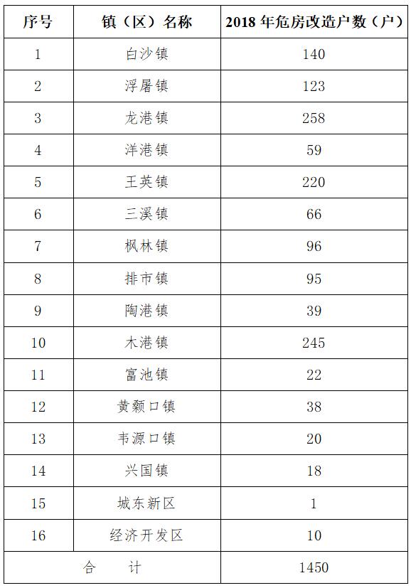 2018年,全县农村危房改造计划完成1450户,各镇(区)对照2018年农村危房改造任务表(详见附件),精心组织,制订方案,确保2018年10月前全面完成农村危房改造任务。