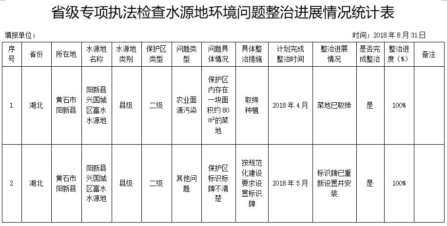 省级专项执法检查水源地环境问题整治进展情况统计表