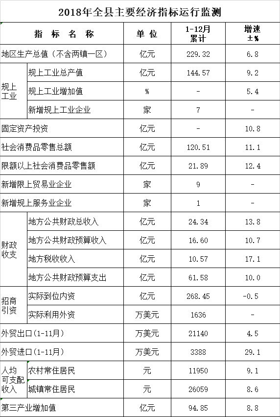 2018年全县主要经济指标运行监测