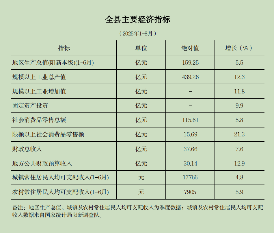2025年1-8月全县主要经济指标