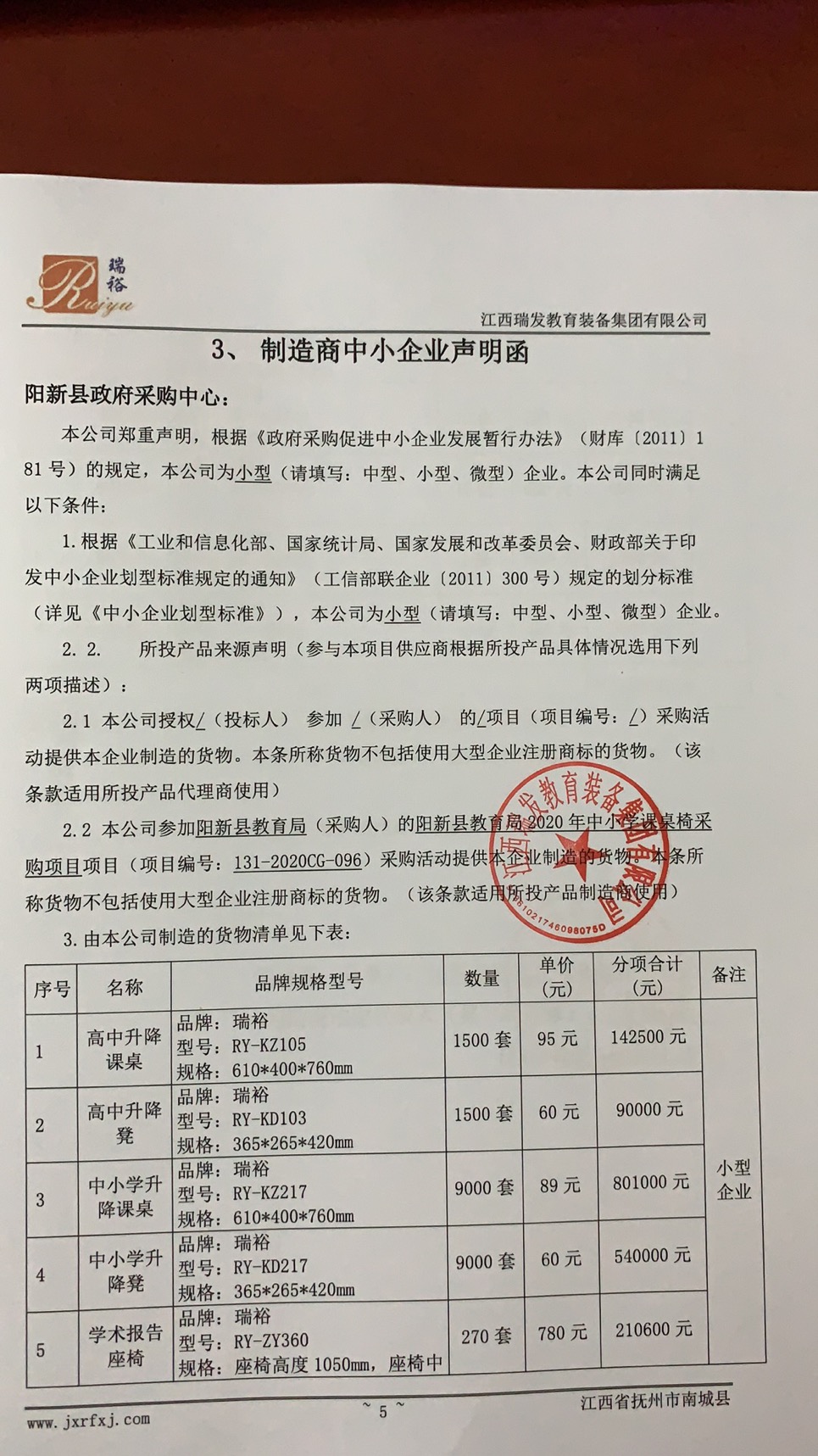 名称:中小学升降课桌 品牌:瑞裕 规格型号:RY-KD217 数量:9000套 单价:89元 |