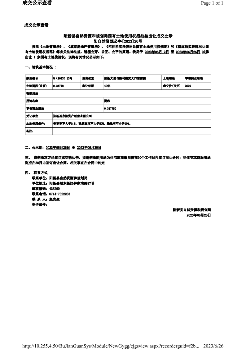 阳新县自然资源和规划局国有土地使用权招拍挂出让成交公示 阳自然资规公字[2023]20号