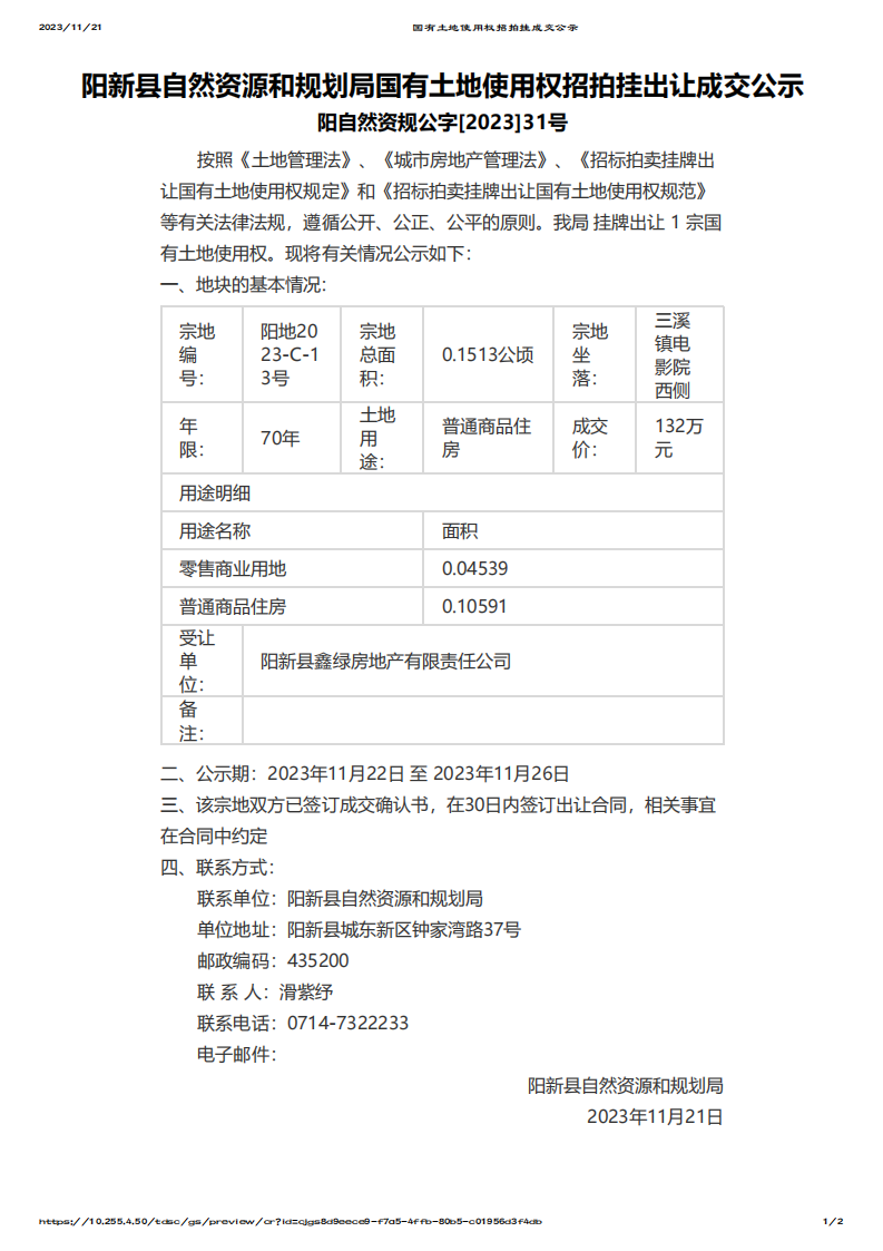 阳新县自然资源和规划局国有土地使用权招拍挂出让成交公示 阳自然资规公字[2023]31号