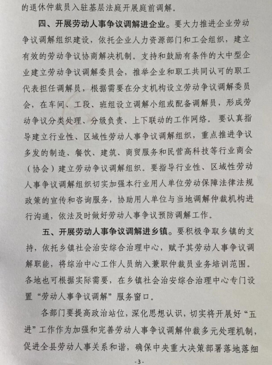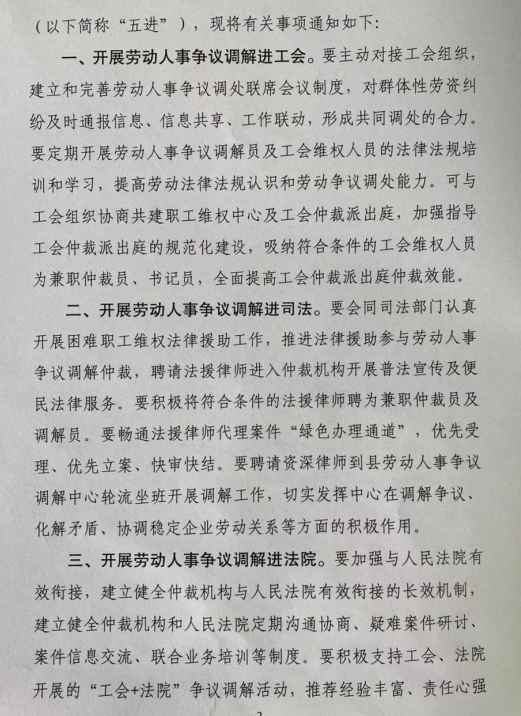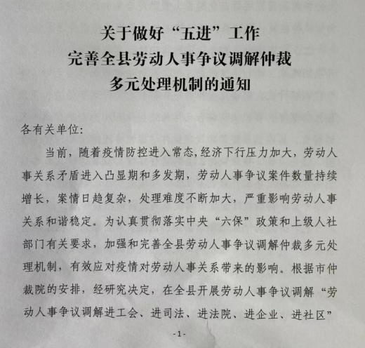 关于做好“五进”工作完善全县劳动人事争议调解仲裁多元处理机制的通知