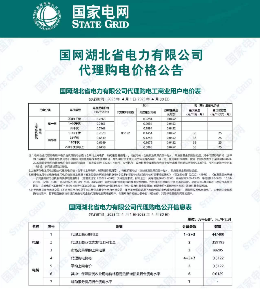 国网湖北省电力有限公司2023年4月代理购电价格公告