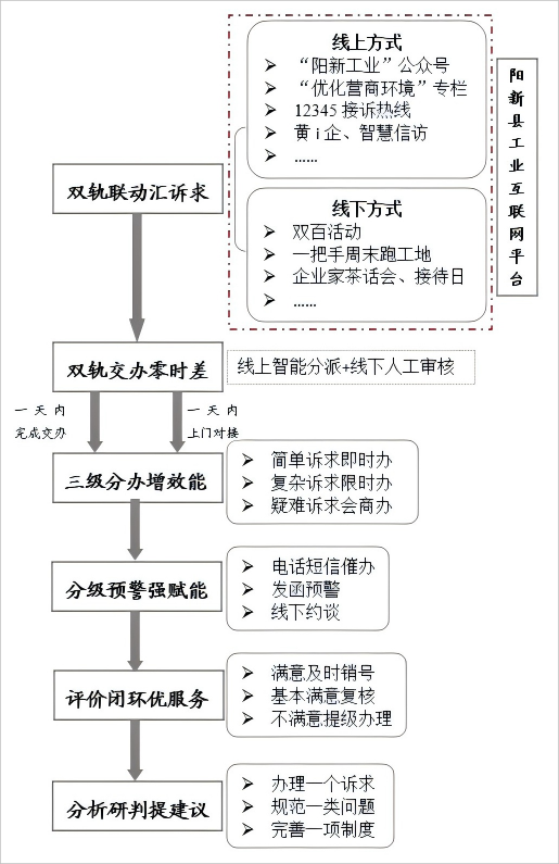 (二)双线联动汇诉求。依托阳新县工业互联网平台,“101”解决机制工作专班(以下简称“101”专班)负责构建多维度、全天候的企业诉求收集网络。线上贯通“阳新工业”公众号、黄i企、阳新县人民政府网“优化营商环境专栏”等载体,畅通政策咨询、问题反馈等多元诉求渠道;同时纵向对接“12345”接诉热线、智慧信访、互联网+督查等平台,推动跨平台诉求信息实时共享。经信部门线下常态化推进“双百”活动、“一把手周末跑工地”、“企业家茶话会”等政企互动机制,动态收集企业诉求。线上线下收集的所有诉求,最终统一归集至阳新县工业互联网平台,形成“一口受理、闭环处置”的高效服务模式。(责任单位:“101”机制成员单位、“双百”活动包保单位、县经信局、县政务服务和大数据局、县信访局、县司法局、县工商联、各镇区等)