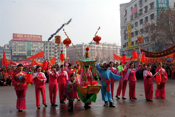 一个旱船班子共由二十五人组成,在一个竹篙结构、红布围成的一丈五尺多长的大旱船中,两边各排十名持桨水手,前头加练歌排水手,中间站着持锣的小旦和击鼓的公共,船尾加上把舵的小丑艄公,形成一个真正的龙舟,音乐为锣鼓强拍伴奏,小旦、公公轮流领唱,众水手齐和的上下句式劳动号子形式。整个表演曲调紧凑,催人奋进,情绪热烈。这种风格独特的民间歌舞形式,多在各种节日表演,深受当地群众喜爱。