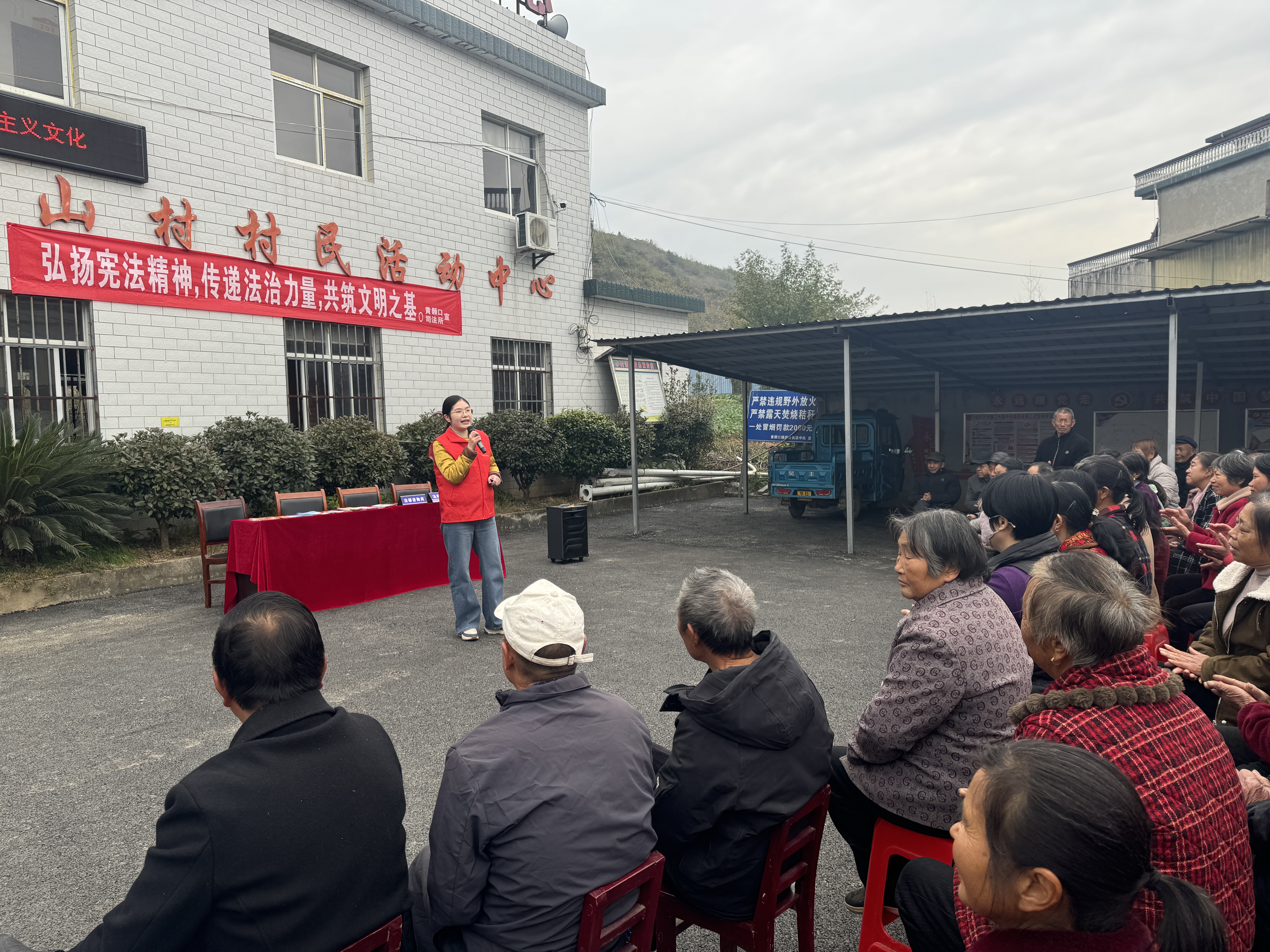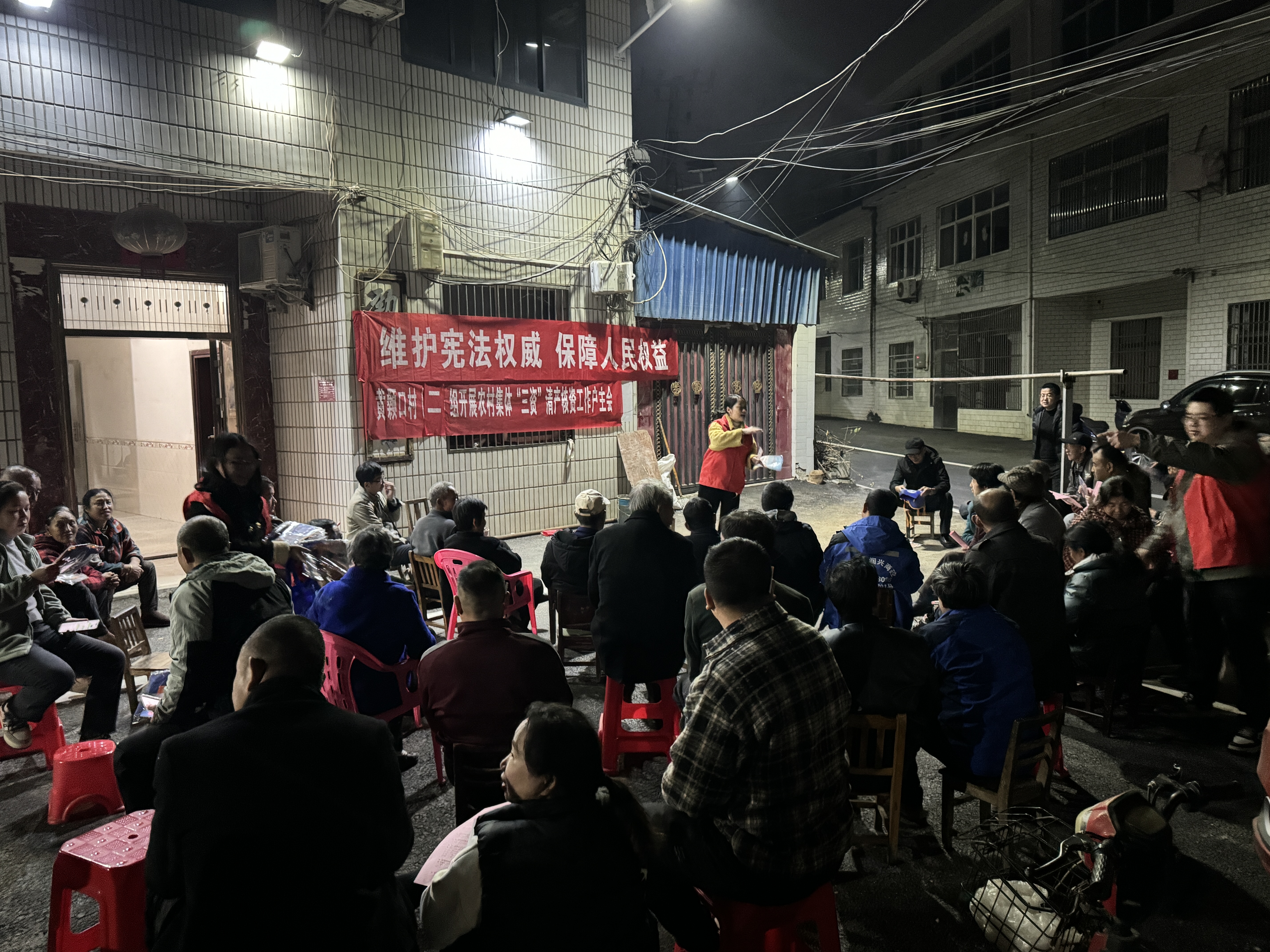 1日傍晚,华灯初上,黄颡口村各湾组庭院内热闹非凡,村民们自发搬起小板凳围坐一堂,一场场“家门口的法治夜话”温情开讲。普法志愿者化身“法律明白人”,摒弃晦涩法条和专业术语,围绕村民最关心的土地流转、邻里纠纷、养老保障、婚姻家庭等热点问题,用“家常话”解读宪法规定与法律条文,结合本地真实案例以案释法、以法说理。现场设置互动交流环节,村民们踊跃提问、积极探讨,志愿者一对一答疑解惑,让宪法知识顺着晚风浸润千家万户,让法治理念在轻松交谈中深植民心。