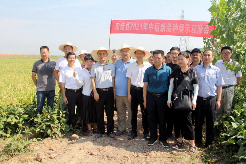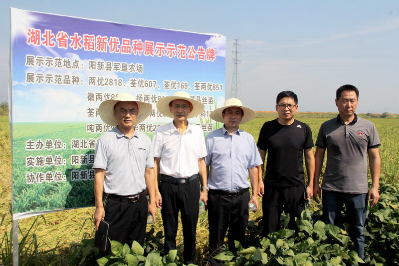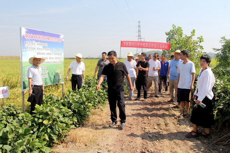 9月24日, 在阳新军垦农场六大队的杂交中稻优质新品种展示稻田里,县农技专家、种粮大户、种子经销企业在现场“看禾选种”。