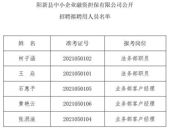 附:阳新县中小企业融资担保有限公司公开招聘拟聘用人员名单