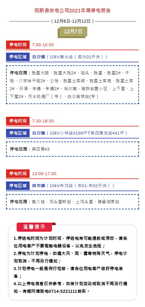 阳新县供电公司2021年周停电预告(12月6日-12月12日)