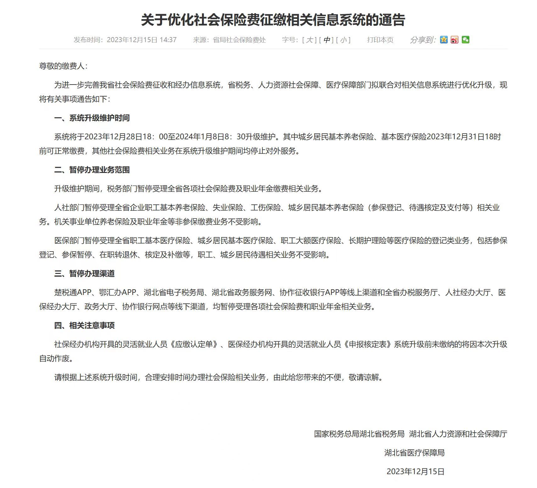 近期,因系统升级维护,税务、人社、医保部门将暂停受理全省各项社会保险费及职业年金缴费等相关业务,直至2024年1月8日8:30。