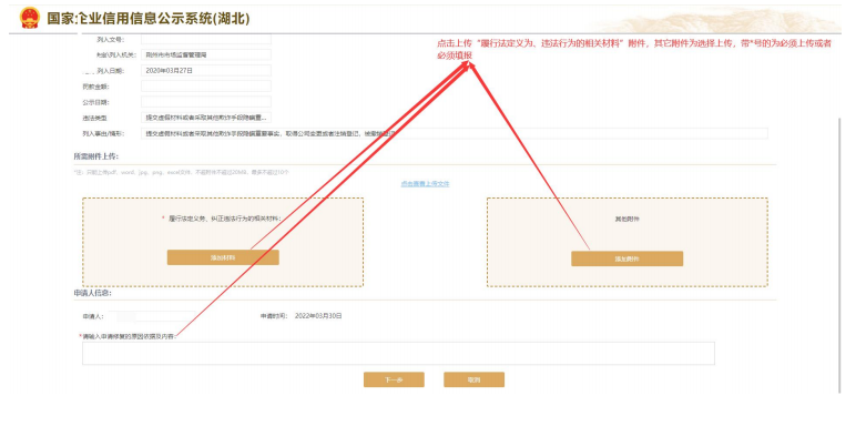 ②点击上传“履行法定义务、违法行为的相关材料”附件,其他附件为选择上传,带*号的为必须上传或者必须填报
