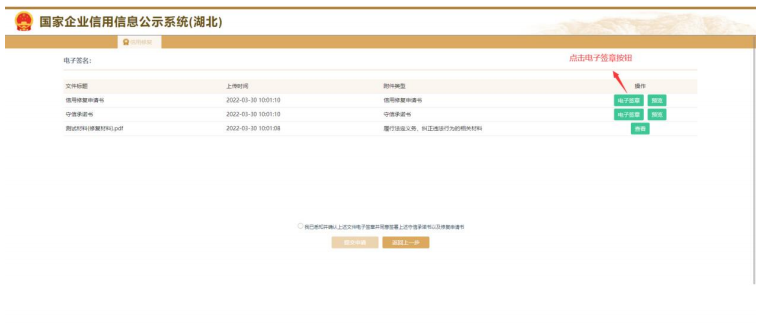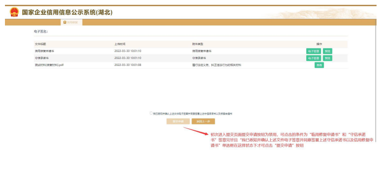 ④初次进入提交页面提交申请按钮为禁用,可点击的条件为“信用修复申请书”和“守信承诺书”签章完毕且“我已悉知并确认上述文件电子签章并同意签署上述守信承诺书以及信用修复申请书”单选框在选择状态下才可点击“提交申请”按钮