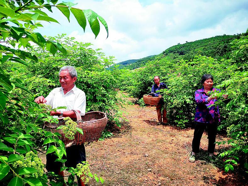 进入7月,阳新县枫林镇早熟腊米喜获丰收。该镇是名贵中药材——腊米主产区,经过几年的发展,已形成育苗、移栽、培化的规模效应。截至目前,该镇已发展腊米3万余亩,其中1.5万亩进入丰产期,今年预计产干果2000吨。图为坳上村村民在采摘腊米。( 赵志刚 )