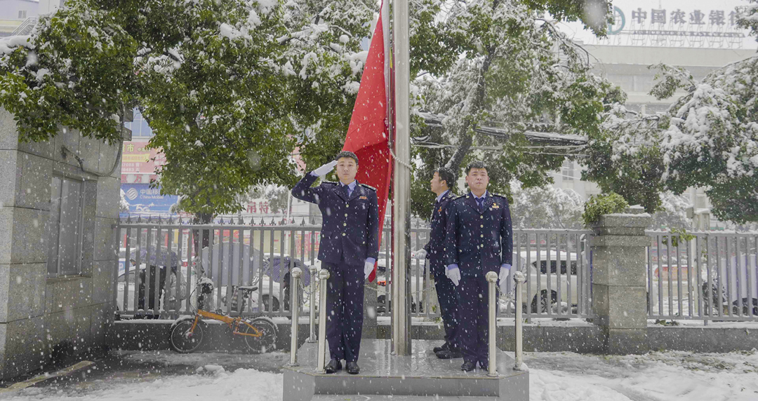 2月7日,在阳新县税务局前院,冉冉升起的五星红旗、蓄势待发的“税务蓝”们与皑皑白雪交相辉映。