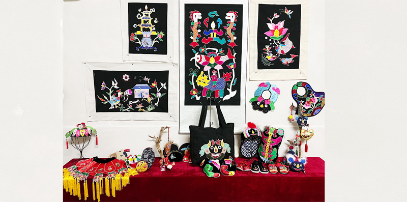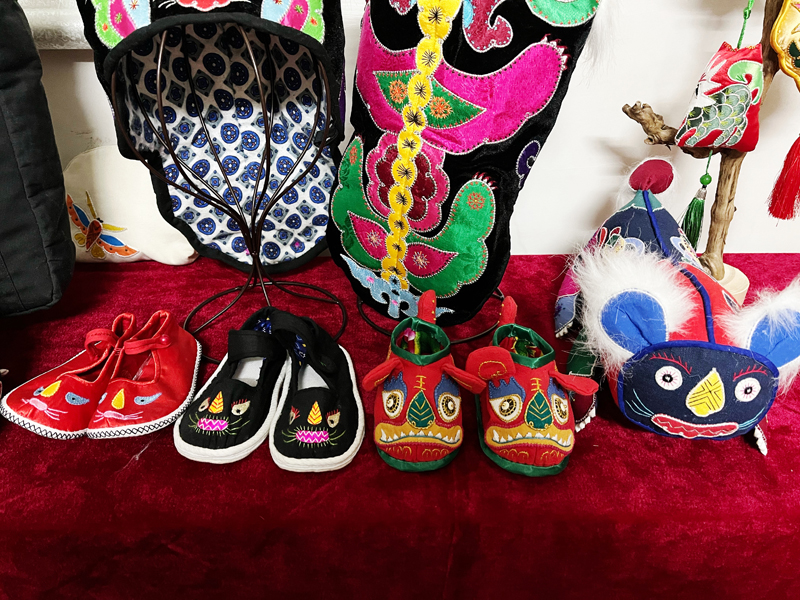 端坐在案桌前,打草稿、定位、裁剪布料、胶粘,几个步骤下来,一块小小的布料,在胡芳手里变成一个俏皮、神气的老虎头。虎帽、虎鞋、虎枕……小小一间工作室里洋溢着浓浓的新年气氛,将寒风冷雨隔绝室外。