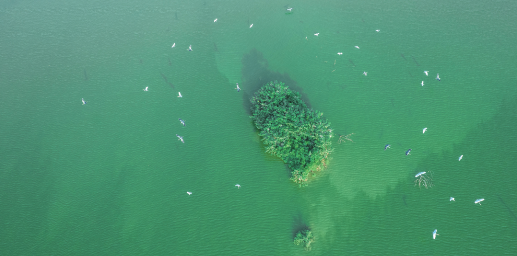 随着阳新莲花湖国家湿地公园生态环境改善,近日,成群的鸟儿在公园一处岛屿上栖息。 通讯员 严建 摄