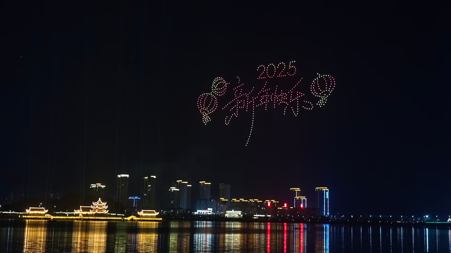 从阳新“五个一”特色产业到红旗红星红土地,从城市剪影到天空之门,无人机以灯光为笔、以艺术为墨,在夜空中编织光影画卷,宛如点点星火点缀在莲花湖夜空,用满满的科技感与艺术感映照着富川大地的活力与繁华。