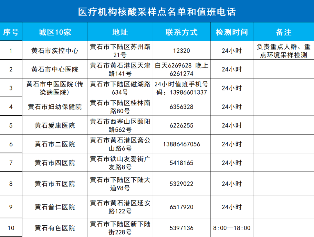 其中城区8家,分别是黄石市疾控中心、黄石市中心医院、黄石市中医医院(传染病医院)、黄石市妇幼保健院、黄石爱康医院、黄石医养医学检验实验室(黄石市二医院、黄石市四医院、黄石市五医院采样,送至黄石医养医学检验实验室检测)、黄石有色医院和黄石普仁医院;